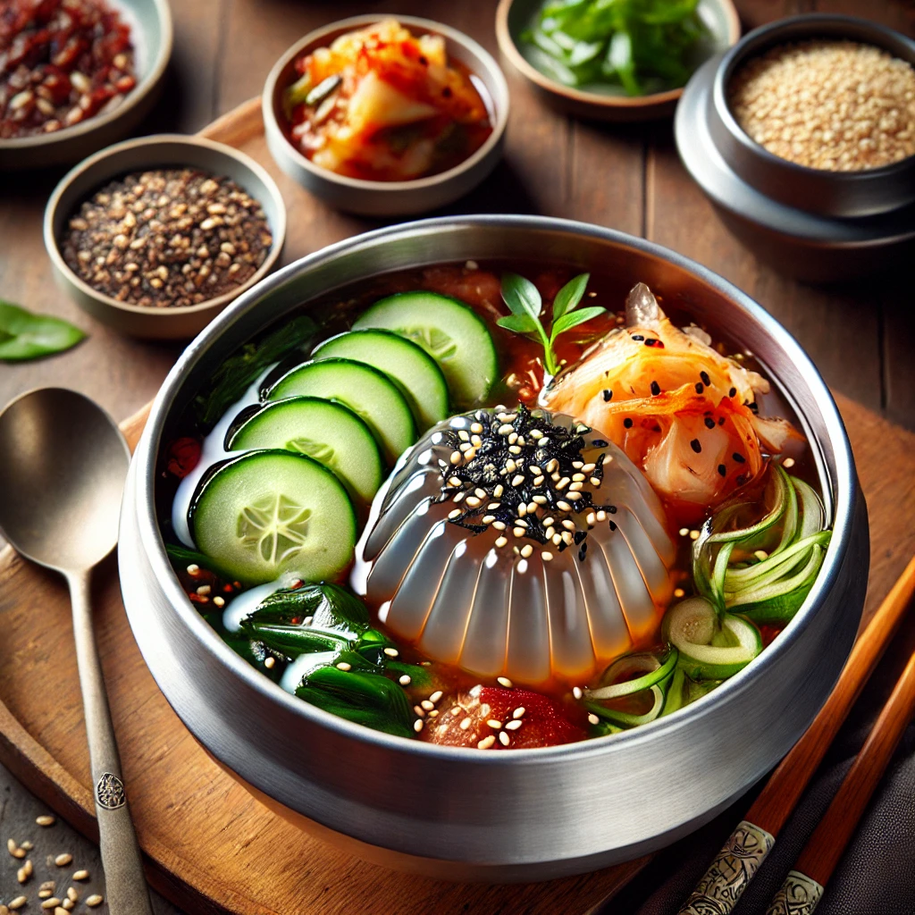 - 큰 볼에 묵과 채소를 담고 물김치 국물이나 냉국을 붓습니다.