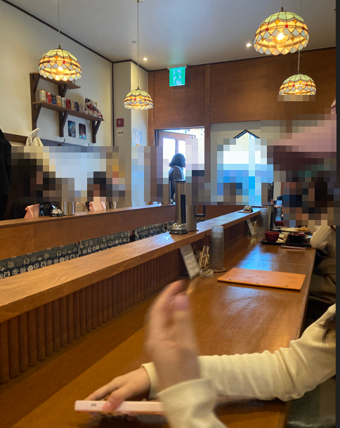 1시 40분쯤 자리에 앉을 수 있었는데, 테이블 구조부터 인상적이었어요. ㄷ자 형태의 테이블 배치에 스테인드글라스 조명까지 더해져, 뭔가 오픈 키친 같은 느낌이면서도 동선은 효율적인 구조! 혼밥도 어색하지 않고, 눈앞에서 셰프님의 움직임을 보는 재미도 쏠쏠했답니다.
