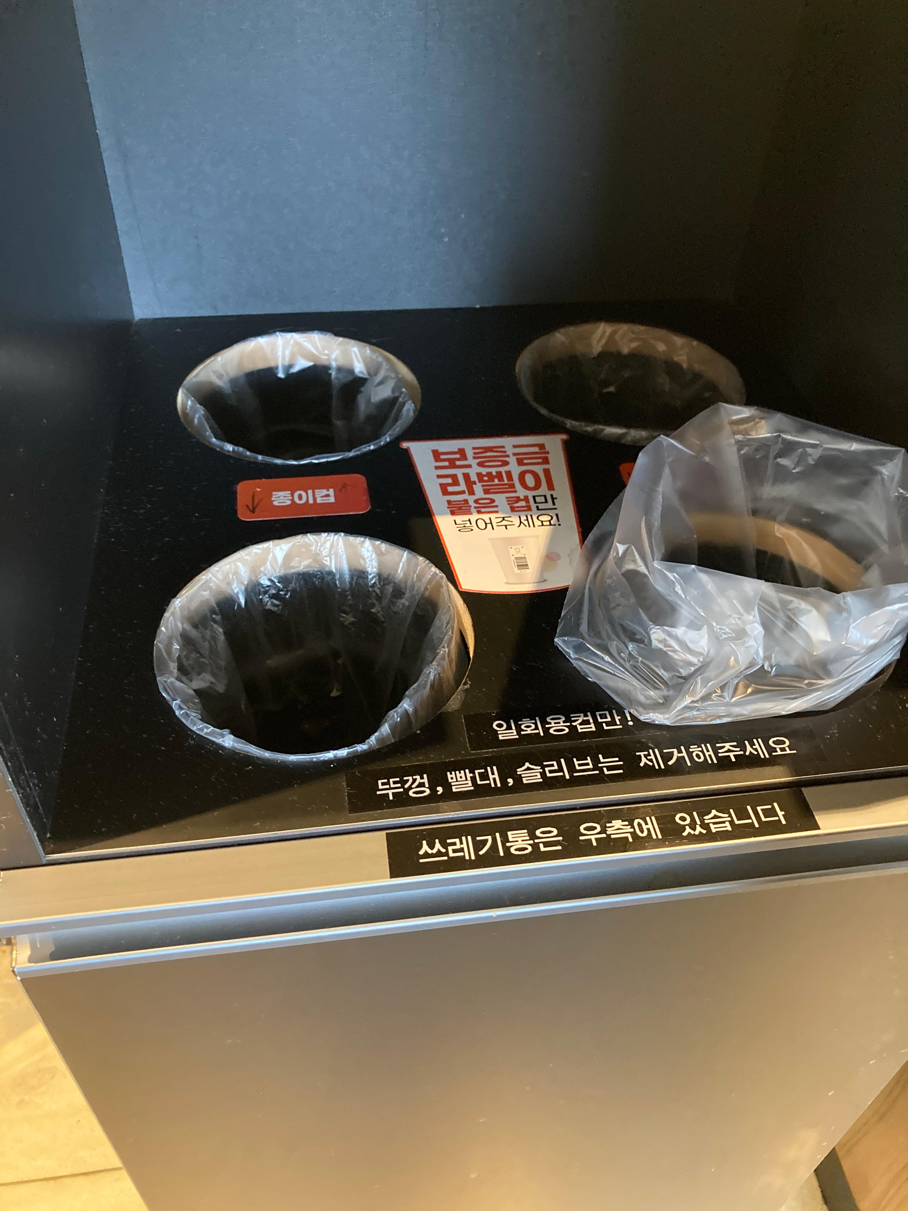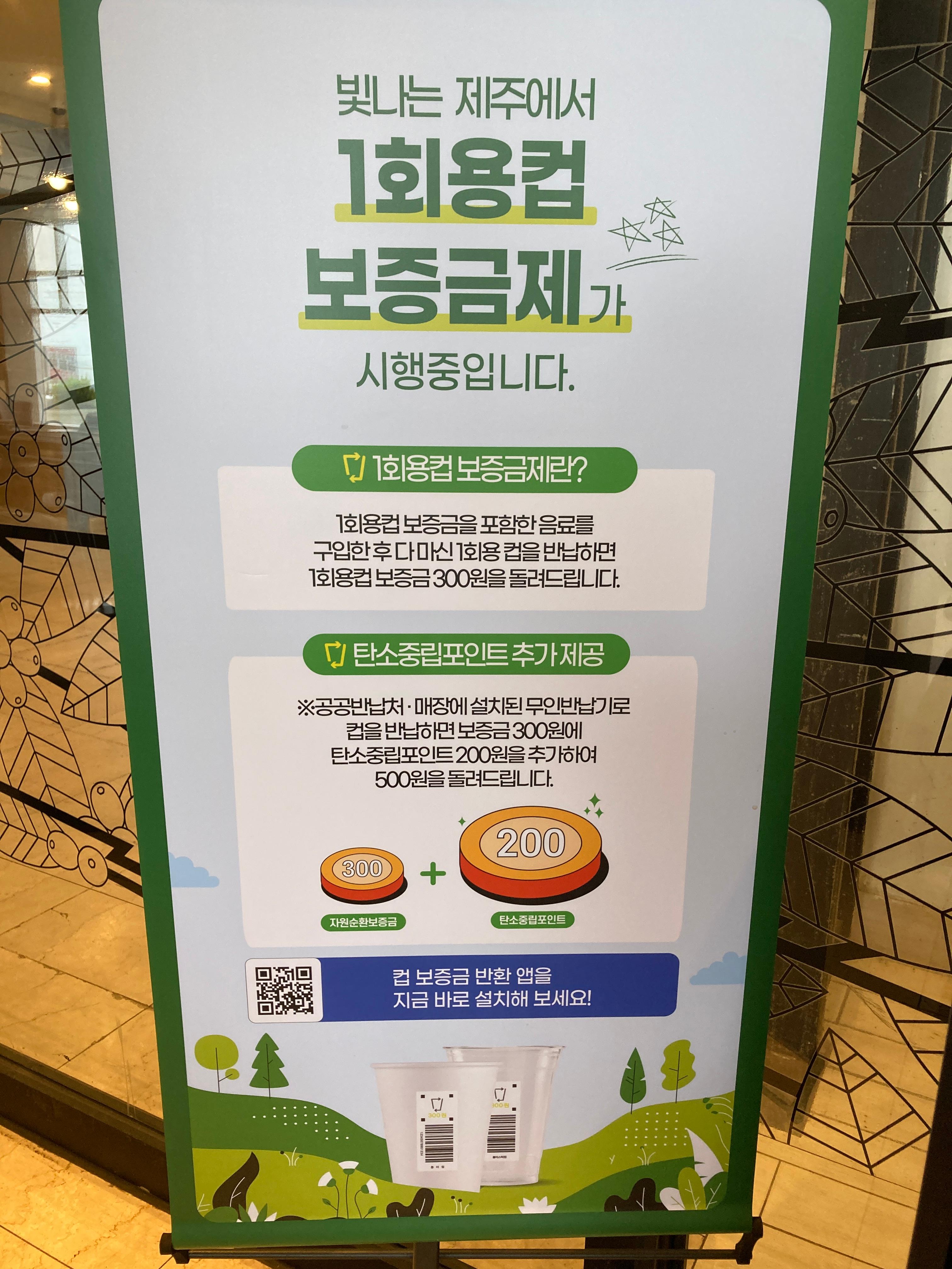 궁금해서 직원에게 물어보니, 컵 하나당 300원의 보증금을 내고, 나중에 반납하면 환급받을 수 있다고 했어요.
