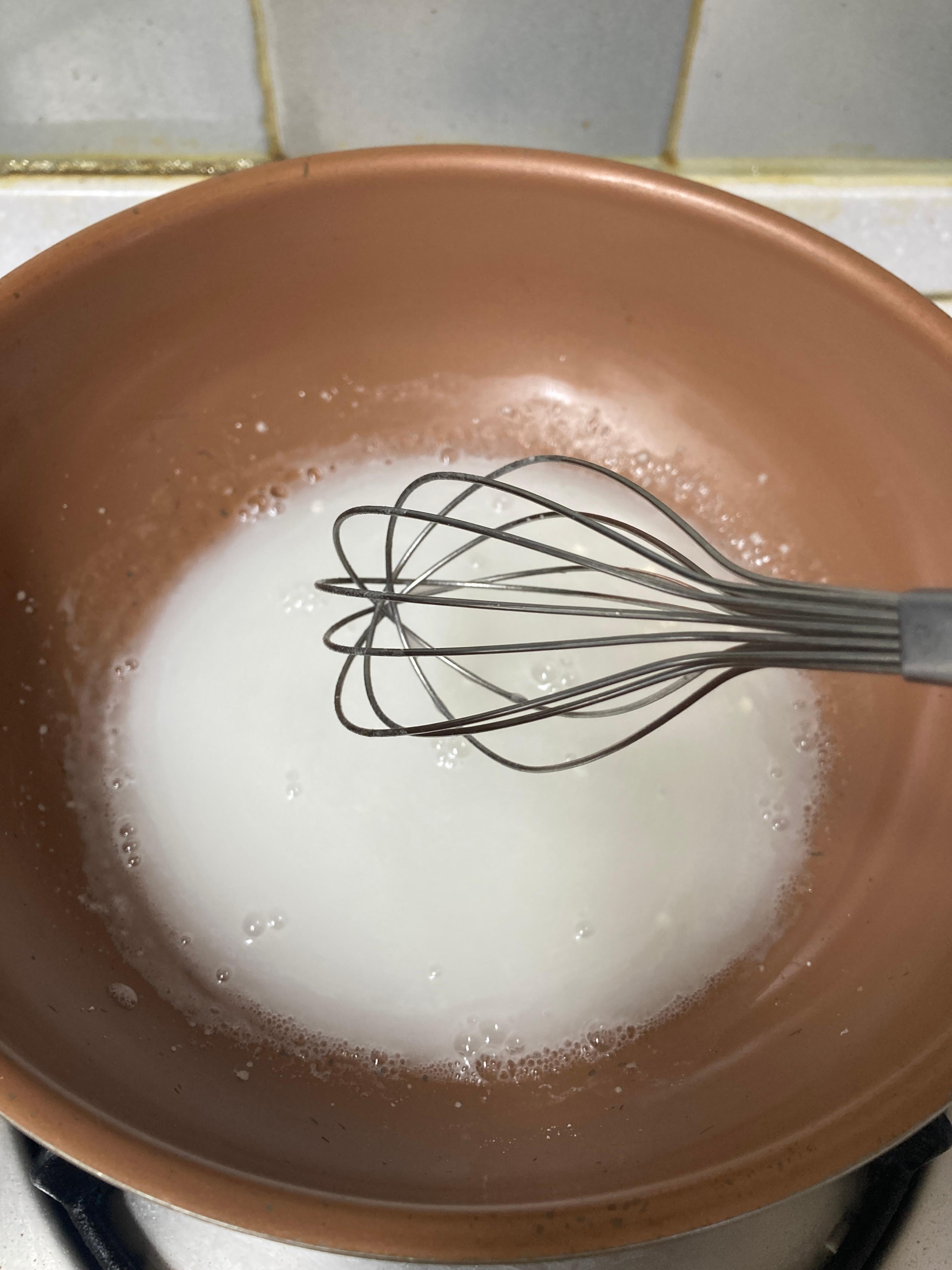 냄비에 물 1컵과 찹쌀가루 1T를 넣고 약불에서 저어가며 끓여주세요. 걸쭉해지면 불을 끄고 식혀줍니다.