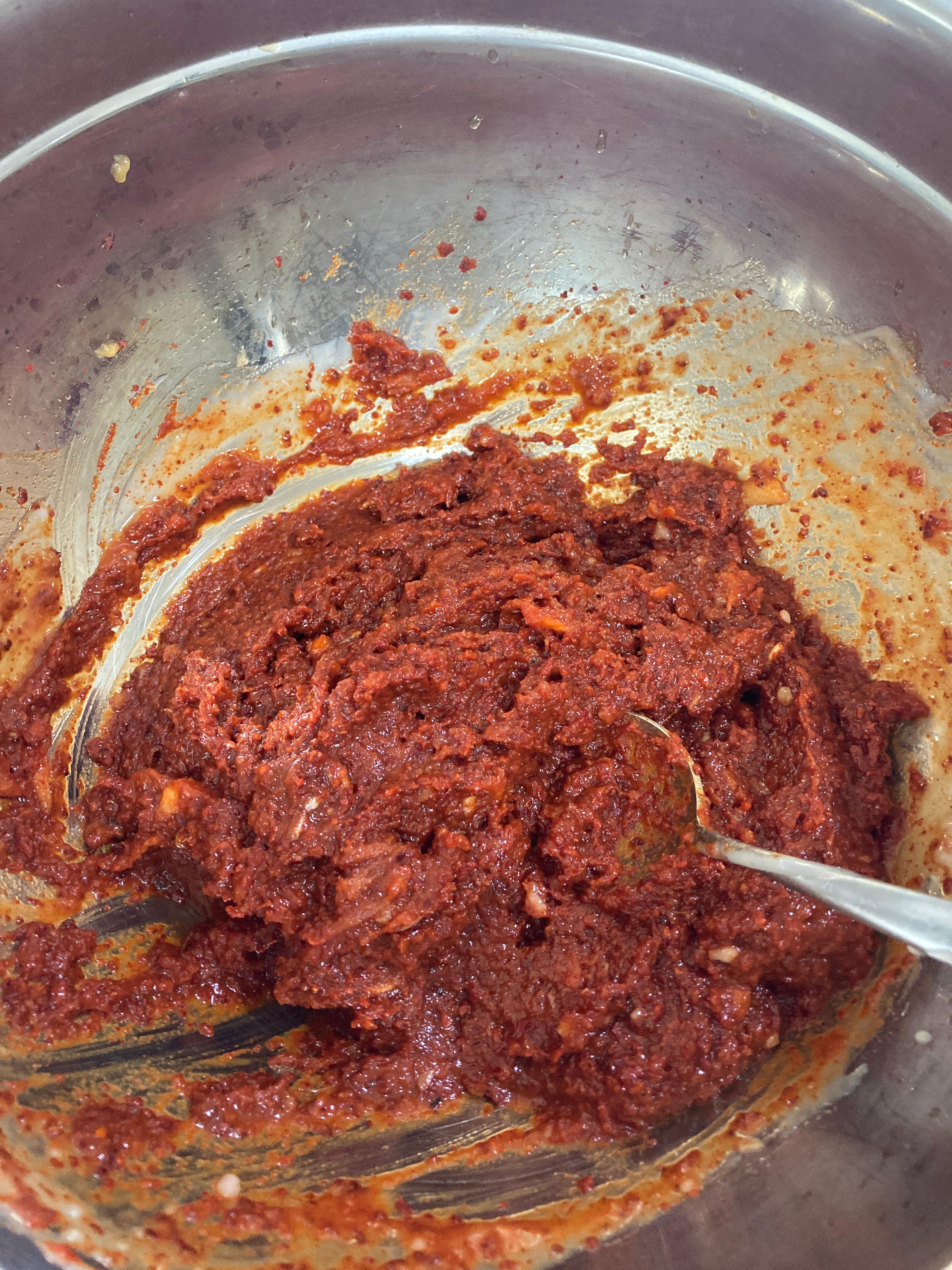 고춧가루, 다진마늘, 다진생강, 매실청, 설탕, 새우젓 국물을 모두 넣고 잘 섞어주세요.