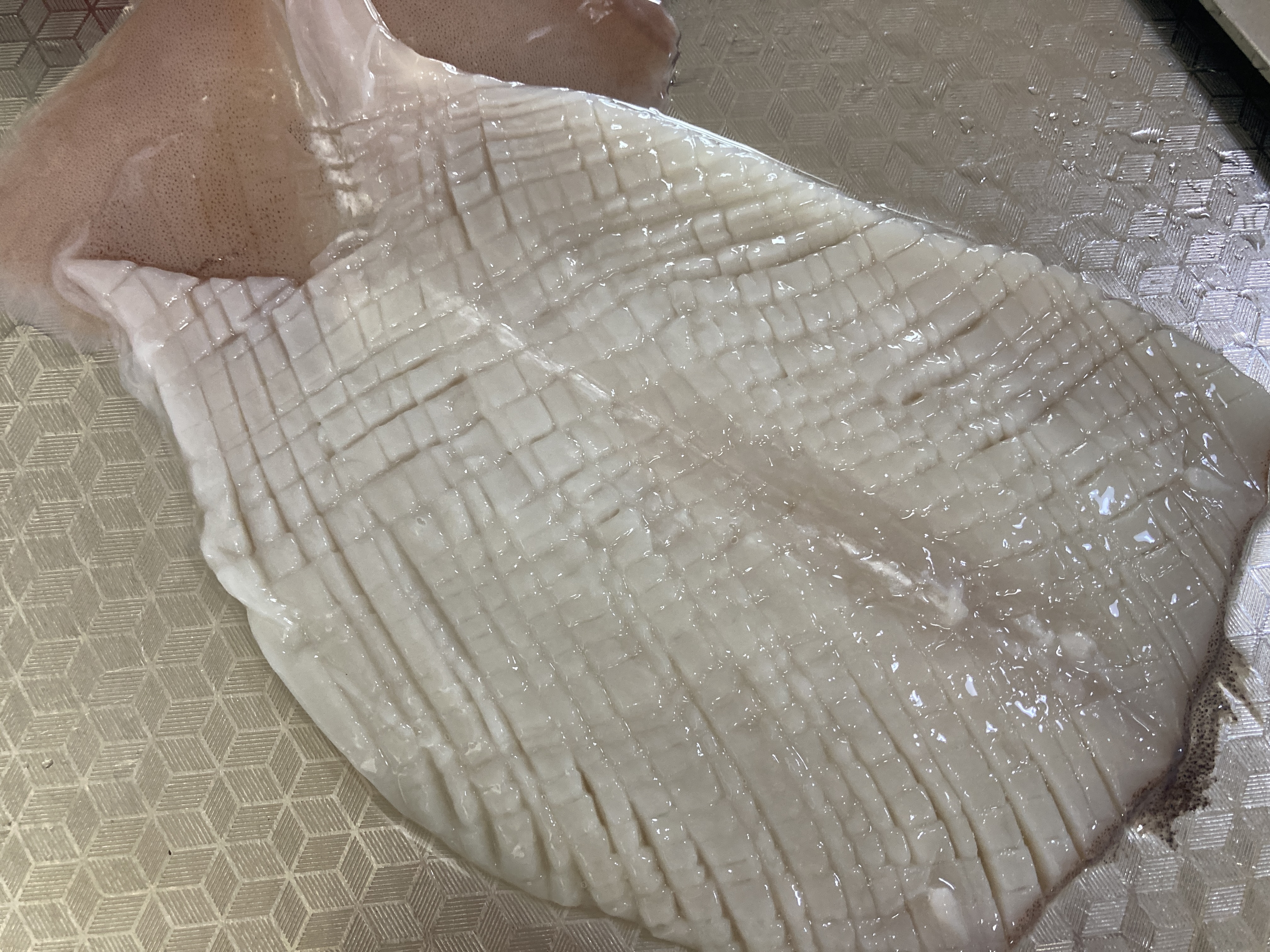 오징어 껍질을 벗긴 다음, 몸통에 사선으로 예쁘게 칼집을 넣어줘요. ✨
