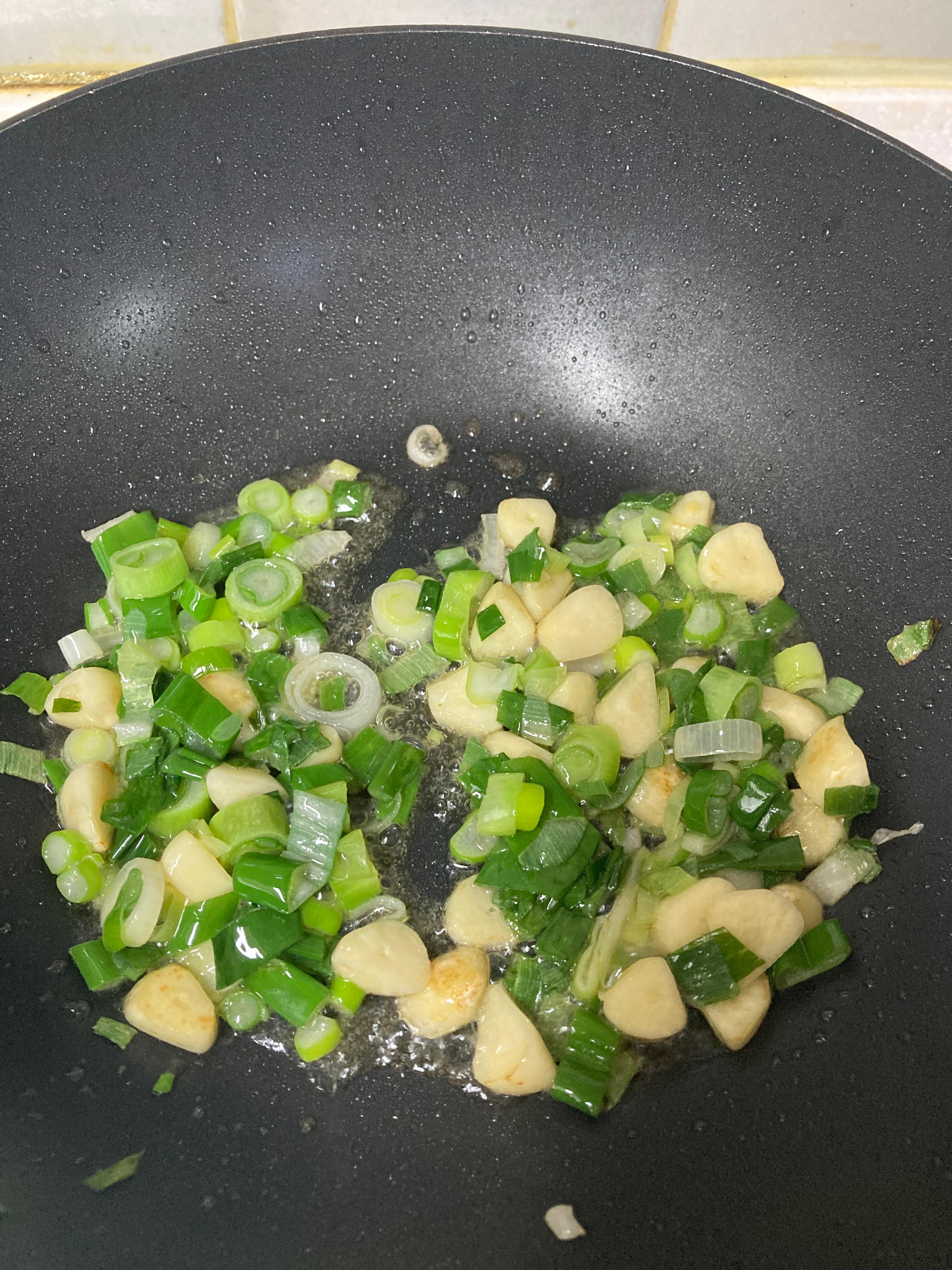 팬에 식용유를 두르고 다진 마늘 한 숟가락 + 대파를 넣고 볶아주세요.