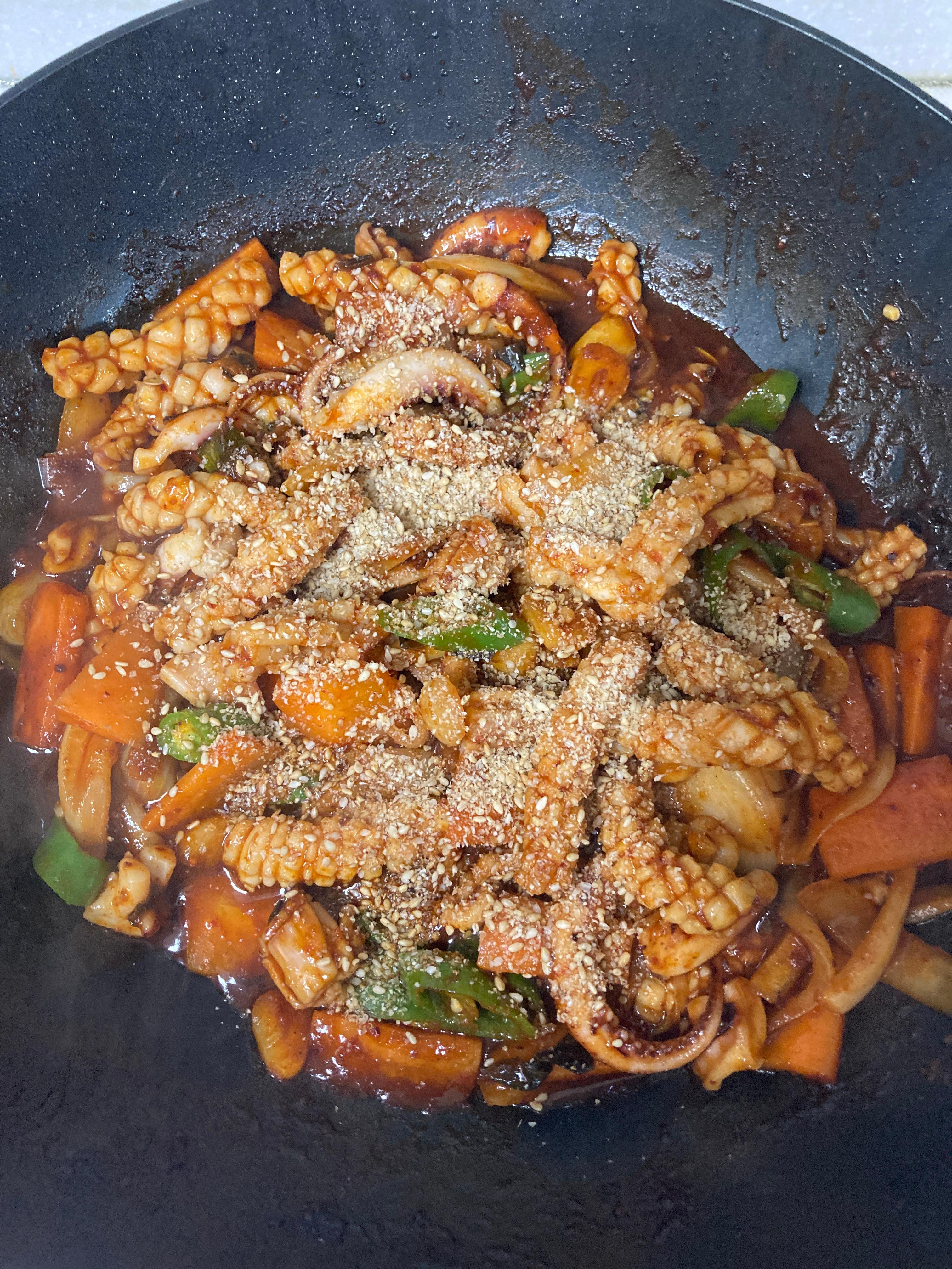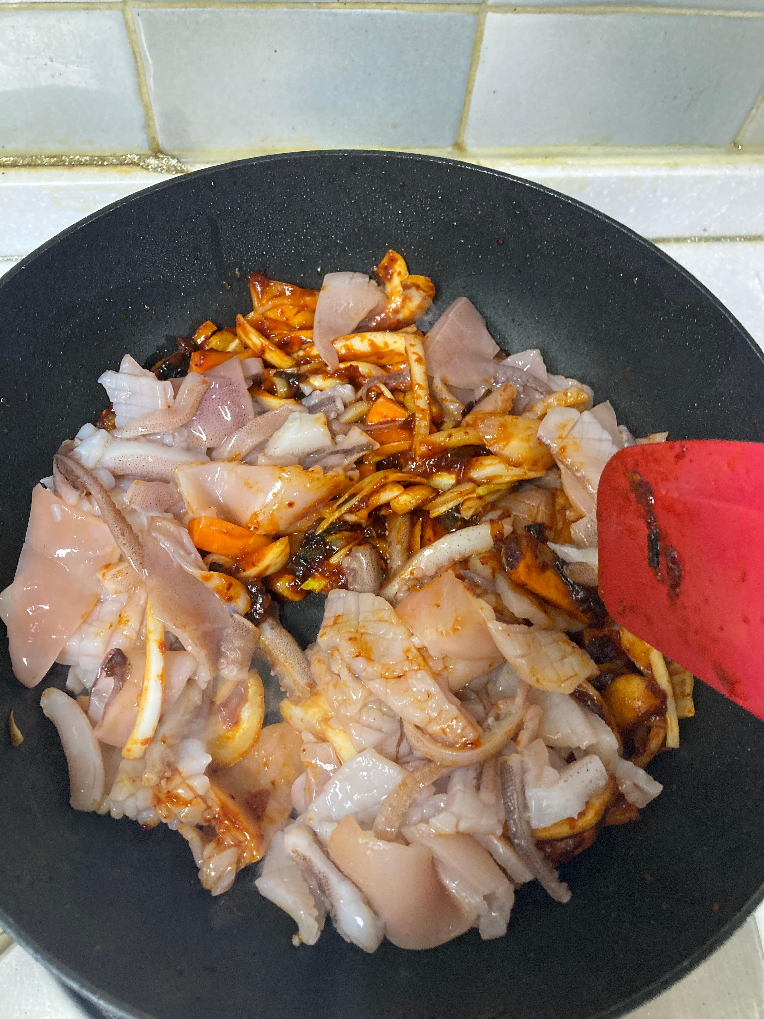 👉 오징어가 양념에 착 감기면서 빨갛게 물드는 순간…!