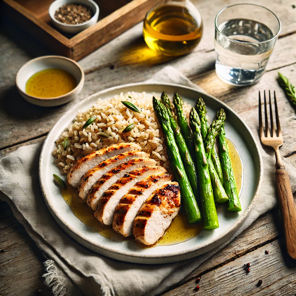 - 현미밥 + 닭가슴살 + 아스파라거스 + 올리브 오일